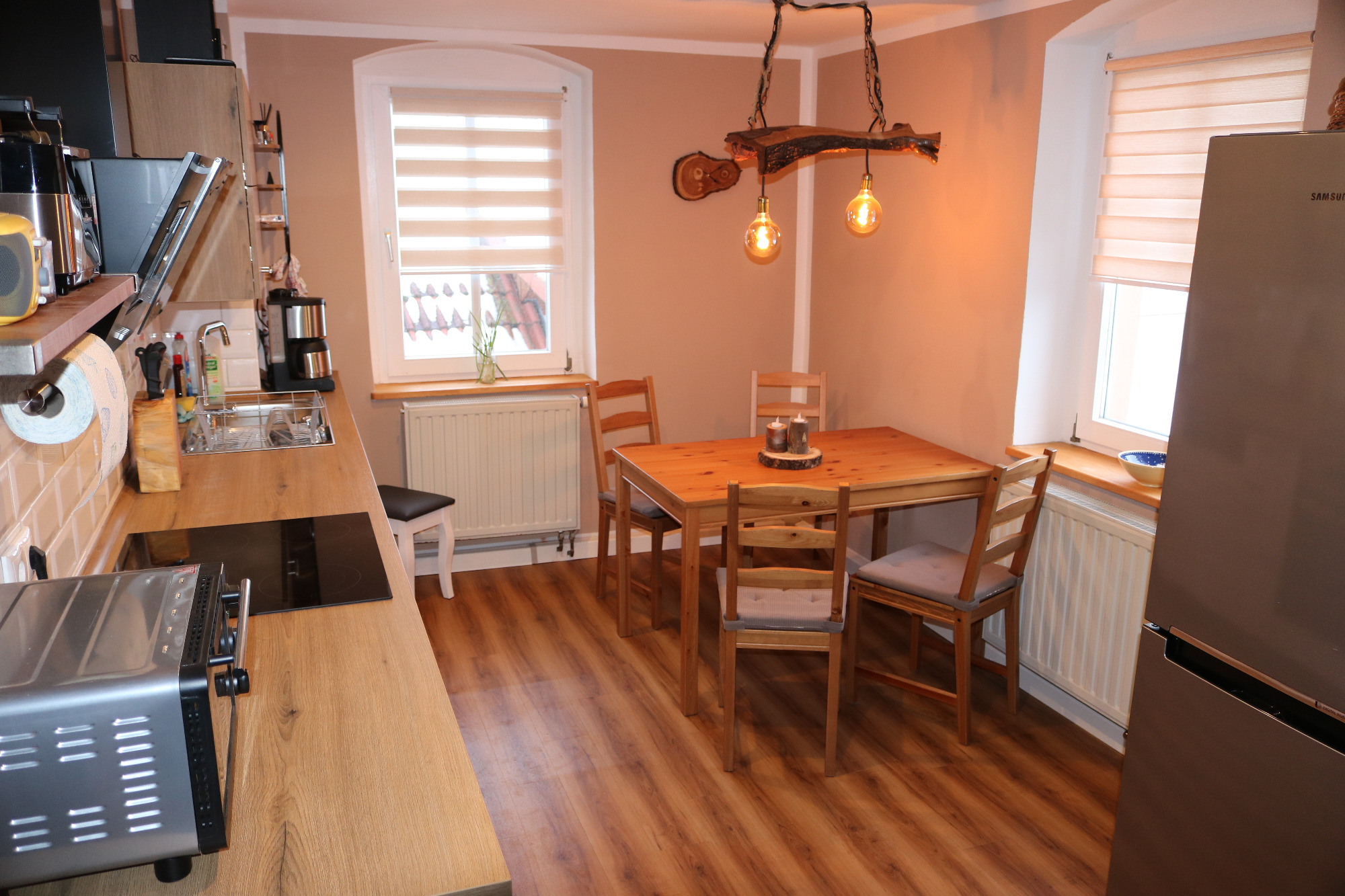 Die große Essküche mit Elektroherd und Umluftbackofen, großem Kühlschrank, moderner Geschirrspüler, Essbereich sowie kompletter Küchenausstattung ist für Tagesausflügler wie