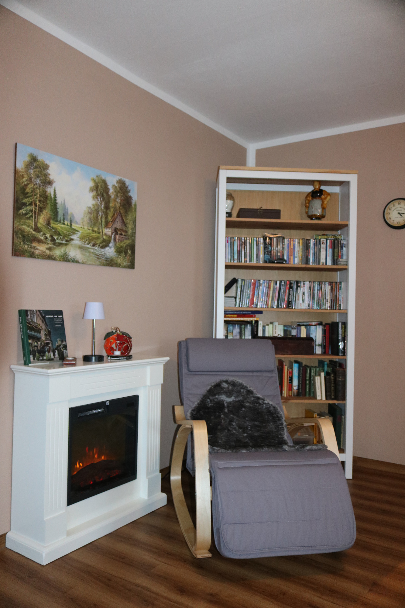 Eine Leseecke mit Relaxsessel am romantisch flackernden Elektro-Kamin (fernbedienbar) lässt keine Wünsche für einen chilligen Tag offen.